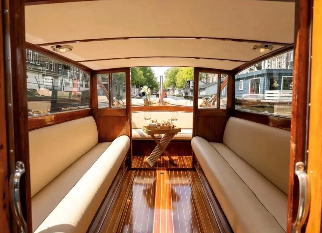 Your private canal cruise takes place aboard an elegant, fully electric boat, captained by an experienced professional. We offer different boats per season for comfort in all weather. Guests enjoy chilled Champagne from the onboard refrigerator, a discreet sound system for relaxed ambiance, and smooth, quiet cruising through Amsterdam’s most beautiful waterways.